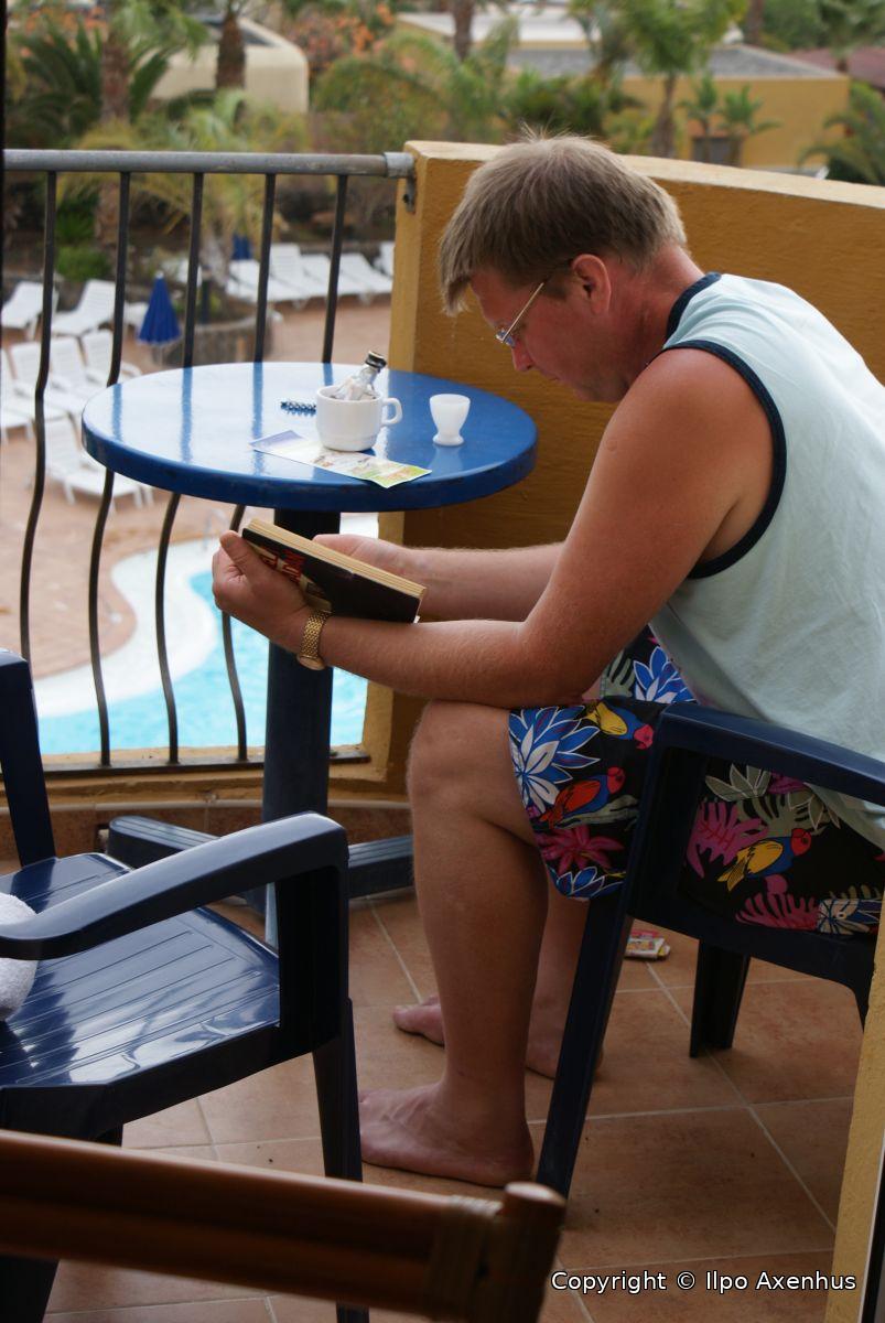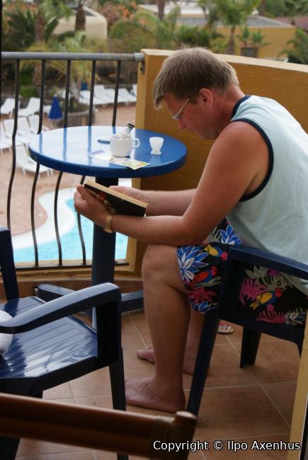 På eftermiddagen var det skönt att läsa en bok....med lite kaffe ( ta med eget,svenskt kaffe är bäst..) och en liten,liten pilliknakare,,,,(kolla koppen)